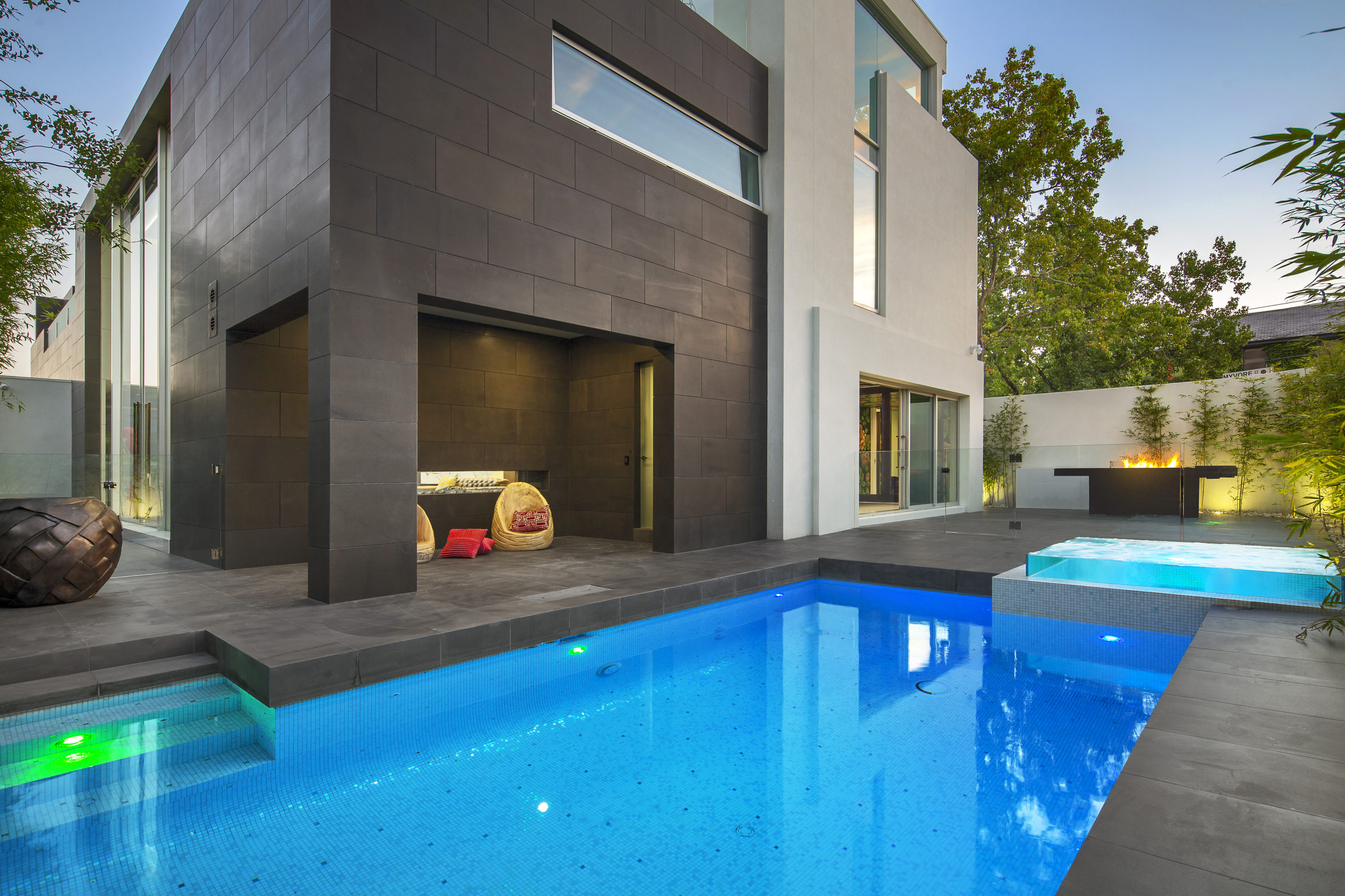 The new design included adding a spa to one corner of the pool. This required cutting and rejoining the existing shell. As a feature the spa was elevated by 300mm with a four sided glass box with water spilling over all sides. The walls around the pool are a combination of bluestone tiles and crushed glass render. A 4m x 2m outdoor screen hangs opposite the spa in an entertainer’s dream.